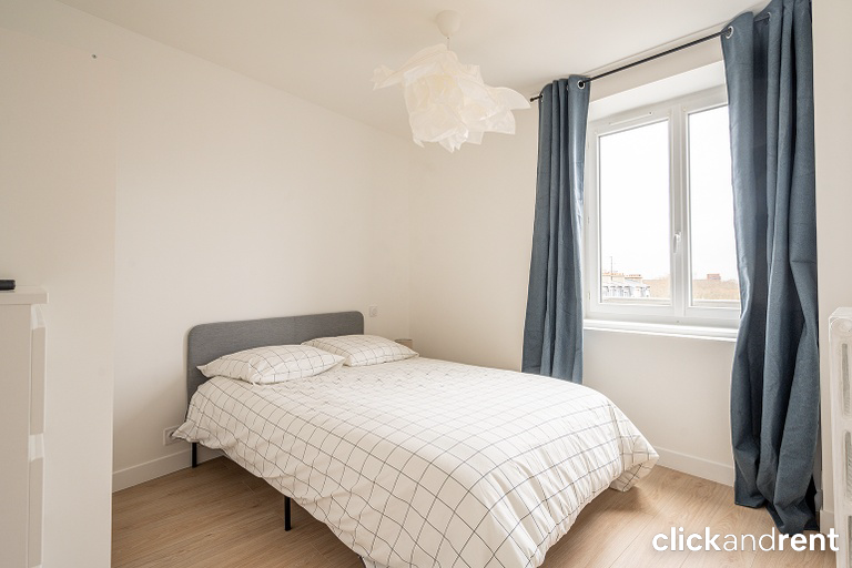 La chambre à louer est entièrement meublée et équipée d'un lit double, d'une commode et est décorée avec goût.