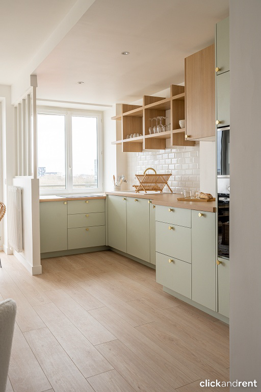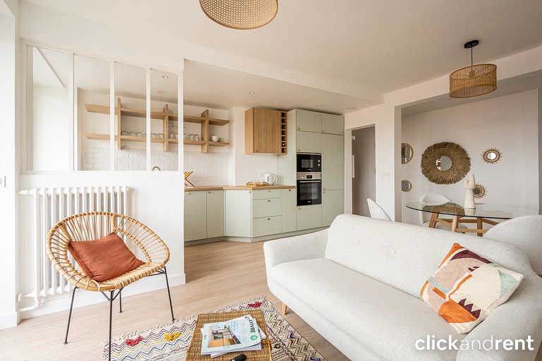 L'appartement est loué meublé et est composé d'une cuisine entièrement équipée (réfrigérateur, plaques de cuisson, four, micro-ondes, lave-vaisselle, ustensiles de cuisine et vaisselle...) ouverte sur un salon/salle à manger.
