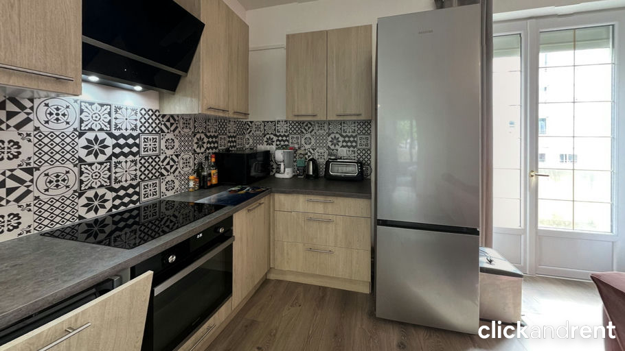 - Cuisine ouverte et entièrement équipée : four connecté, micro-ondes, frigo, lave-vaisselle, cafetière, bouilloire, grille-pain