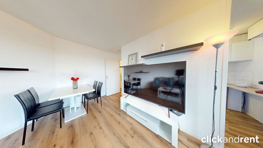 L’appartement se compose d’une entrée, d’un séjour accueillant avec rangements, d’une cuisine ouverte parfaitement intégrée à l’espace de vie, d’une chambre confortable avec placard et d’une salle de bains avec WC. L’agencement est fluide, les volumes bien pensés et l’ensemble est prêt à vivre, avec un mobilier sobre et pratique.
